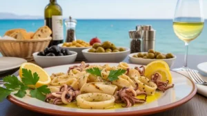 Greek seafood restaurants serve calamari with lemon and olive oil. Spanish bars include it in tapas menus. Portion sizes stay small for sharing.